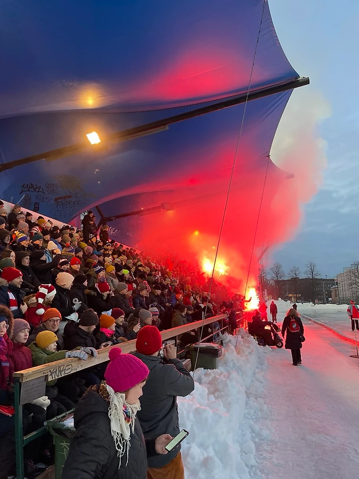 Стадион Брахенкентта небольшой, но очень уютный. Основная трибуна с натянутым козырьком вмещает 400 человек, с двух сторон от неё ещё две небольших – еще по человек 30. В Рождественское дерби этих трибун не хватает, и десятки человек стоят прямо у кромки поля. Но средняя посещаемость здесь – около ста человек, причём в этом сезоне это во многом стало возможным благодаря переезду «синих» в центр города – на домашнем льду в Оулункюля нередко доводилось видеть на трибунах и меньше пятидесяти. В основном это друзья и родственники, хотя есть и болельщики. Но постоянных фанатов, в отличие от ХИФКа, который представлен во всех видах спорта, нет.