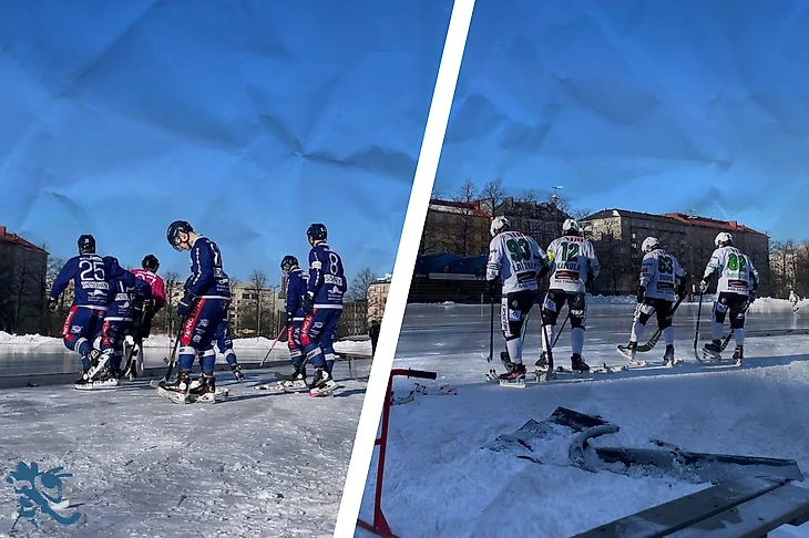 Раскатившись, команды традиционно для хоккея с мячом собрались перед стартовым свистком, что интересно – игроки «Акиллеса» делают это не у ворот, а у трибуны, рядом с болельщиками.