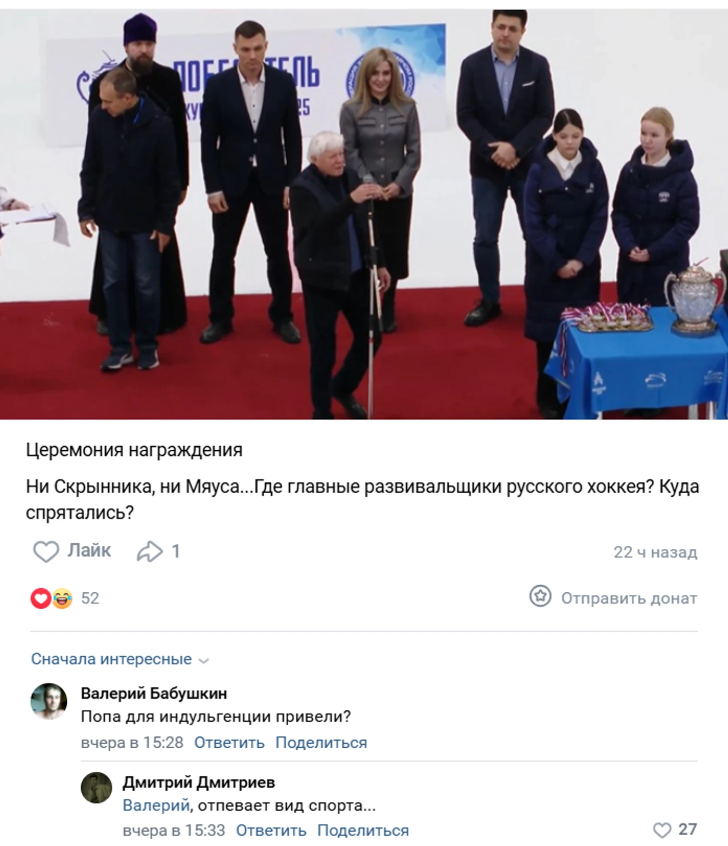 На скриншоте видно, что церемонию награждения проводили: директор по организации и проведению соревнований Федерации хоккея с мячом России (ФХМР) Юрий Молотков, президент столичной федерации Дмитрий Буров, главный редактор журнала «Персона страны» Елизавета Абрамова и духовник сборной России Даниил Зубов. «Отпевает вид спорта», - пошутил все тот же Дмитриев уже в комментариях.