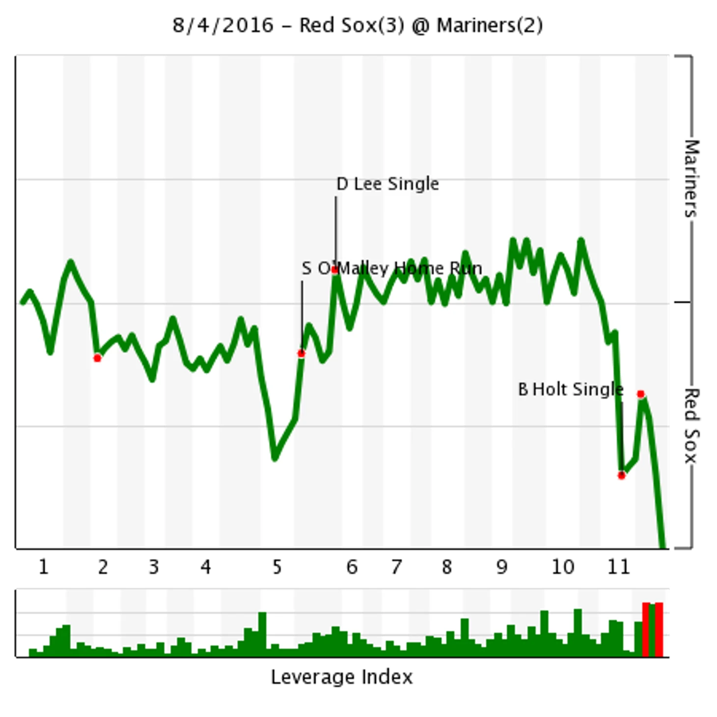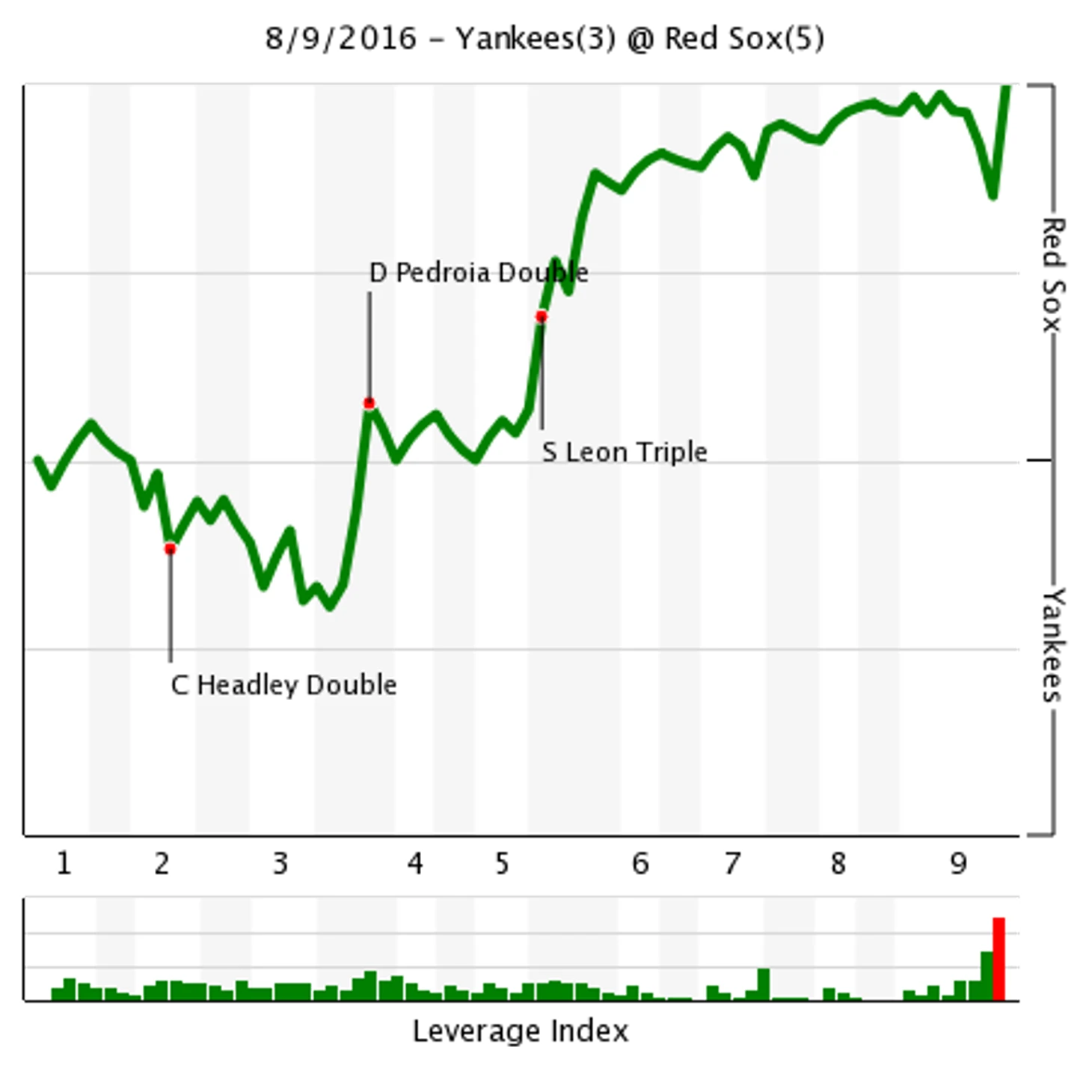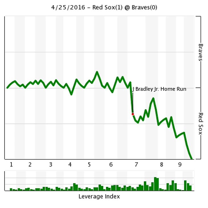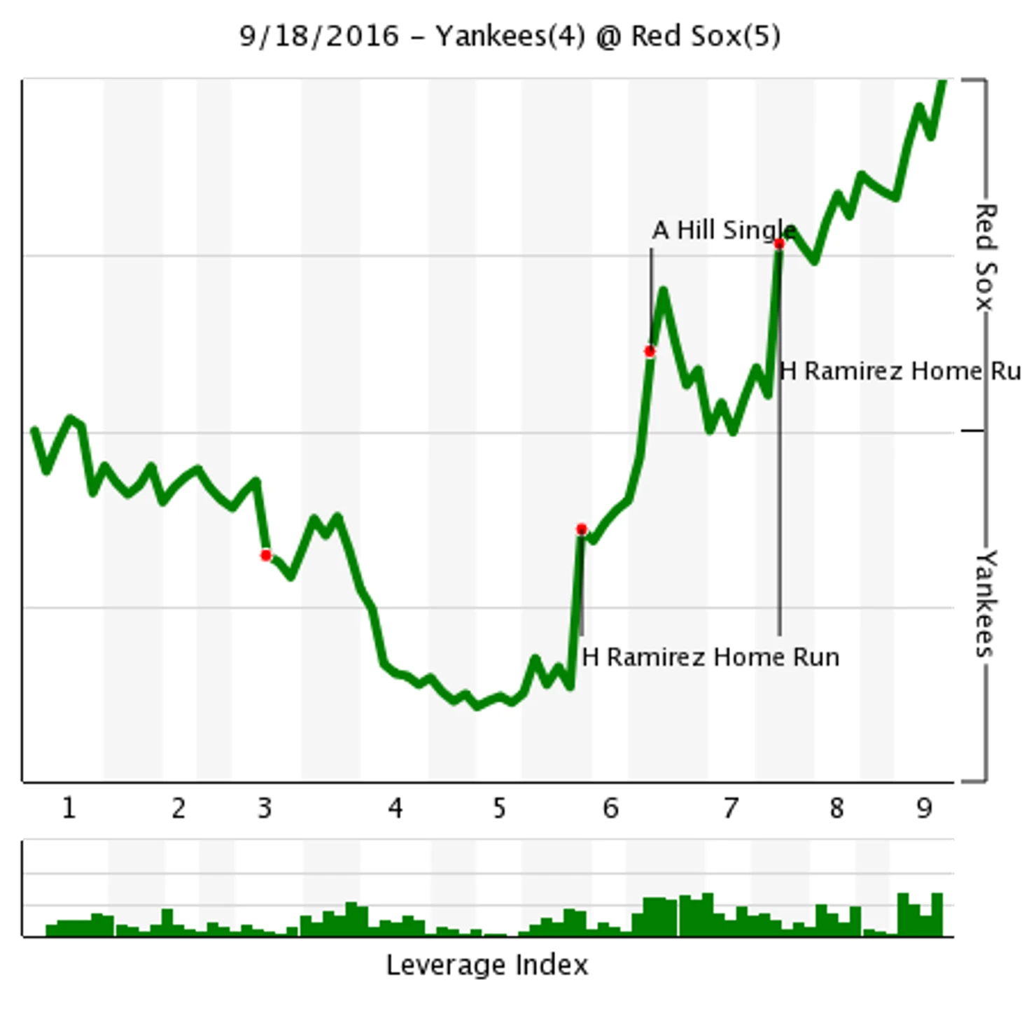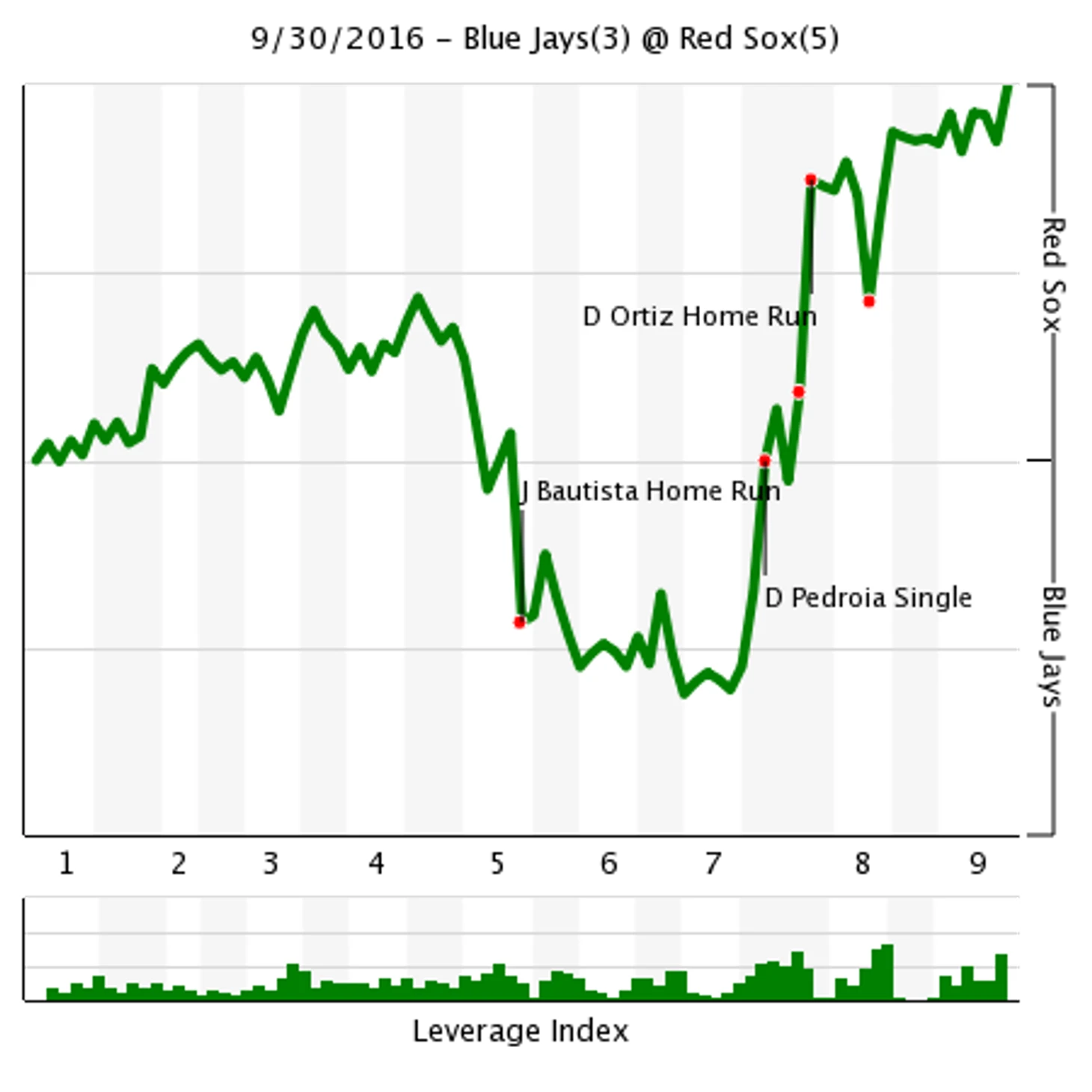 Впрочем, достаточно предисловия. Легенду вы знаете - 27 лучших игр прошлого сезона (почему 27? Потому что в бейсболе всё кратно девяти - 9 иннингов, 9 игроков в лайнапе, да и вообще в игре как раз 27 аутов), для каждой из которых будет предоставлена ссылка на мой отчёт о ней, Box Score игры, краткое описание от меня, и, конечно, видеообзор, чтобы красочно освежить память. Ну и в этом сезоне я решил ещё добавить к каждой игре изменения вероятности победы по ходу игры - порой там очень прикольные графики получались, особенно вверху списка. Но сразу скажу, что при составлении хит-парада я на них внимания не обращал, они чисто для фана.Первая часть посвящена победам №27-№19, чуть позже выйдут ещё две части. Но перед началом обратного отсчёта можете в качестве аперитива взглянуть на видеообзоры 9 побед, которые в список так и не попали (ну правда очень много было драматических побед):