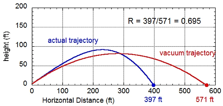 К примеру мяч пролетел 397 футов, в то время как в вакууме он бы проделал расстояние в 571. Отношение бы было равным 397/571=0,695, что говорило, что атмосфера, которая окружает мяч во время полета, дала пролететь мячу в реальности лишь 70 % от возможного.
