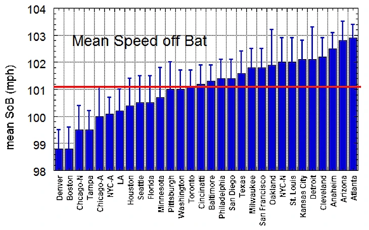 Обратным тому, как боллпарк "помагает", будет и значение того, какая скорость после контакта с мячом должна быть для того, чтобы мяч перелетал через забор.