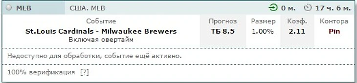 03:15 St.Louis Cardinals - Milwaukee Brewers. ТБ 8.5 К=2.11 Pinnacle +++