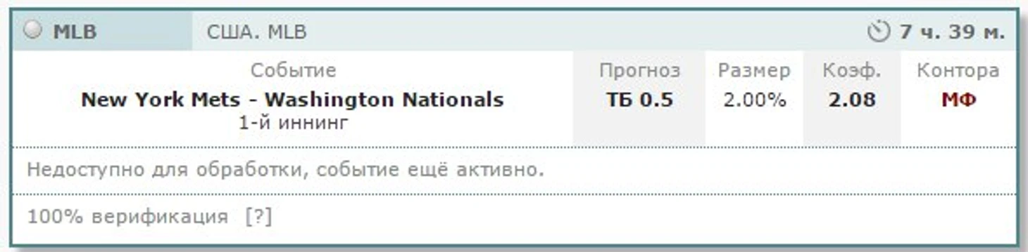 02:10 New York Mets - Washington Nationals. 1-й иннинг ТБ 0.5 К=2.08 Марафон 300 ---