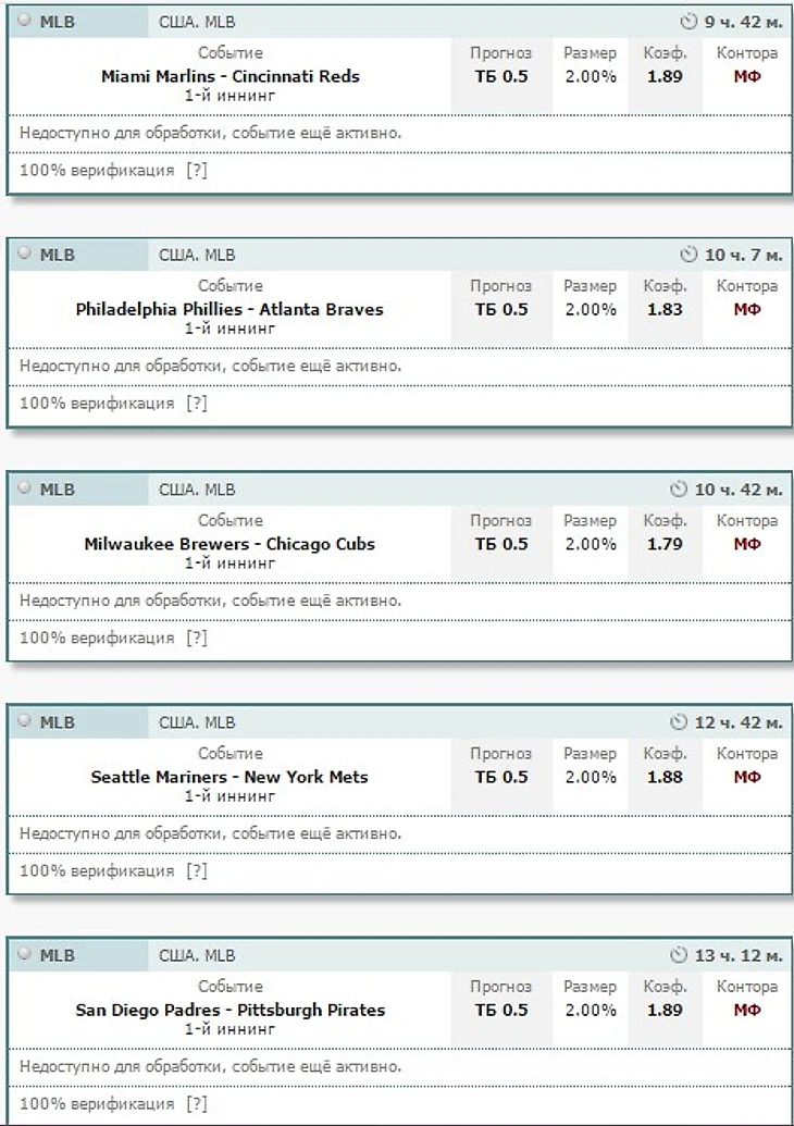 20:35 Philadelphia Phillies - Atlanta Braves. 1-й иннинг ТБ 0.5 К=1.83 Марафон 300 ---