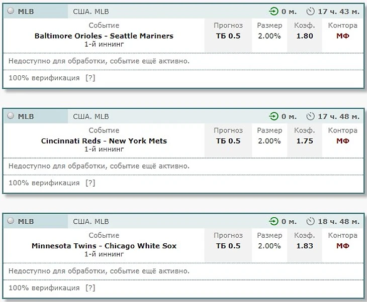 02:05 Балтимор Ориолз - Сиэтл Маринерз. 1-й иннинг ТБ 0.5 К=1.80 Марафон 300 +++