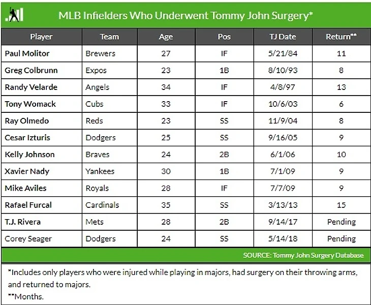 После того как Кори Сигер отправился в мае 2018 года на Томми Джона создателем статьи была собрана информация по игрокам инфилда с аналогичной травмой и сроками восстановления :