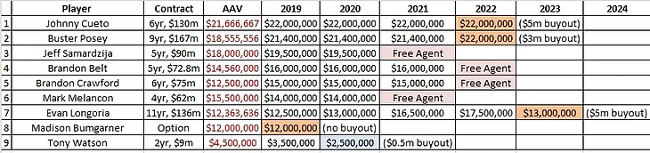 Следующие два игрока - ветераны команды, твердые середнячки основы. Первый бейсмэн Брэндон Бэлт и шорт-стоп Брэндон Кроуфорд, достаточно молоды и талантливы, чтобы вернуться в 2019 году. Но их контракты оставляют желать лучшего. Особенно сильно изменилась оценка стоимости Бэлта - рынок первых базовых рухнул с того момента, как он переподписал контракт.