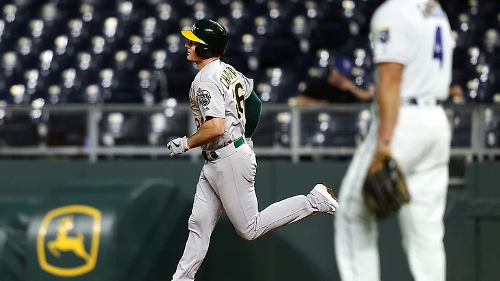 "Канзас-Сити Ройалс"-"Окленд Атлетикс" 4:19.Во втором иннинге после ошибок питчера хозяев Марк Канья и Сет Браун вывели гостей вперёд.Затем Маркус Симьен выбил трипл (6),а Крис Дэвис с Юриксоном Профаром и Джошем Фегли прибежали в дом.Хозяева ответили хоум-раном (1) Бретта Филлипса и забеганием Буббы Старлинга.В 3 иннинге Сет Браун выбил сингл и Мэтт Олсон прибежал в дом.Затем Джош Фегли выбил сингл и Марк Канья прибежал в дом.Далее Маркус Симьен своим хоум-раном (23) отправил Сета Брауна и Джоша Фегли в дом.В 4 иннинге Крис Дэвис выбил сингл и Мэтт Олсон прибежал в дом.В 5 иннинге Мэтт Чапман выбил дабл (33) и Джош Фегли прибежал в дом.Затем Мэтт Олсон выбил дабл (18),а Робби Гроссман и Мэтт Чапман прибежали в дом.Хозяева ответили синглом Хорхе Солера и забеганием Ники Лопеса.В 6 иннинге Юриксон Профар выбил хоум-ран (16).В 7 иннинге Мэтт Чапман выбил хоум-ран (30).В 8 иннинге Джош Фегли выбил сингл и Крис Дэвис прибежал в дом.После аута Маркуса Симьена Юриксон Профар успел прибежать в дом.В 9 иннинге Крис Дэвис выбил хоум-ран (19).Хозяева ответили синглом Буббы Старлинга после гранд-аута Уайта Меррифилда.