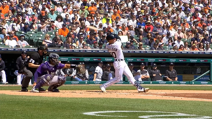 В 6 иннинге Акил Бадду выбил сингл и Харольд Кастро прибежал в дом.Затем Мигель Кабрера выбил сингл,а Акил Бадду и Робби Гроссман прибежали в дом.Далее Хеймер Канделарио выбил сингл и Остин Медоуз прибежал в дом.