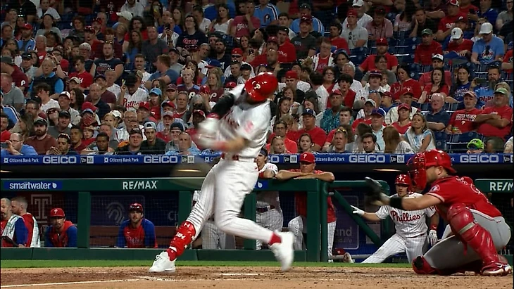 В 5 иннинге Брайс Харпер своим хоум-раном (11) отправил Кайла Шварбера и Риса Хоскинса в дом.Затем Ник Матон выбил трипл (1) и Джей-Ти Реалмуто прибежал в дом.