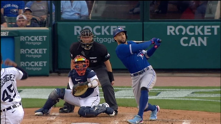 В 6 иннинге Владимир Герреро выбил дабл (7) и Джордж Спрингер прибежал в дом.Затем Алехандро Кирк выбил сингл и Владимир Герреро прибежал в дом.