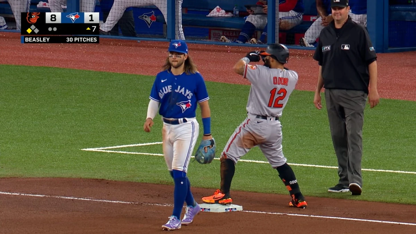 В 7 иннинге Ругнед Одор выбил трипл (3) и Эдли Ручман прибежал в дом.После аута Тайлера Невина Ругнед Одор успел прибежать в дом.