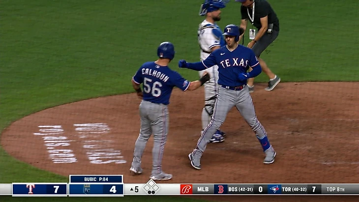 В 6 иннинге Адолис Гарсия выбил дабл (13) и Маркус Семьен прибежал в дом.Затем Коул Калхун выбил сингл,а Кори Сигер и Адолис Гарсия поставили точку в матче.