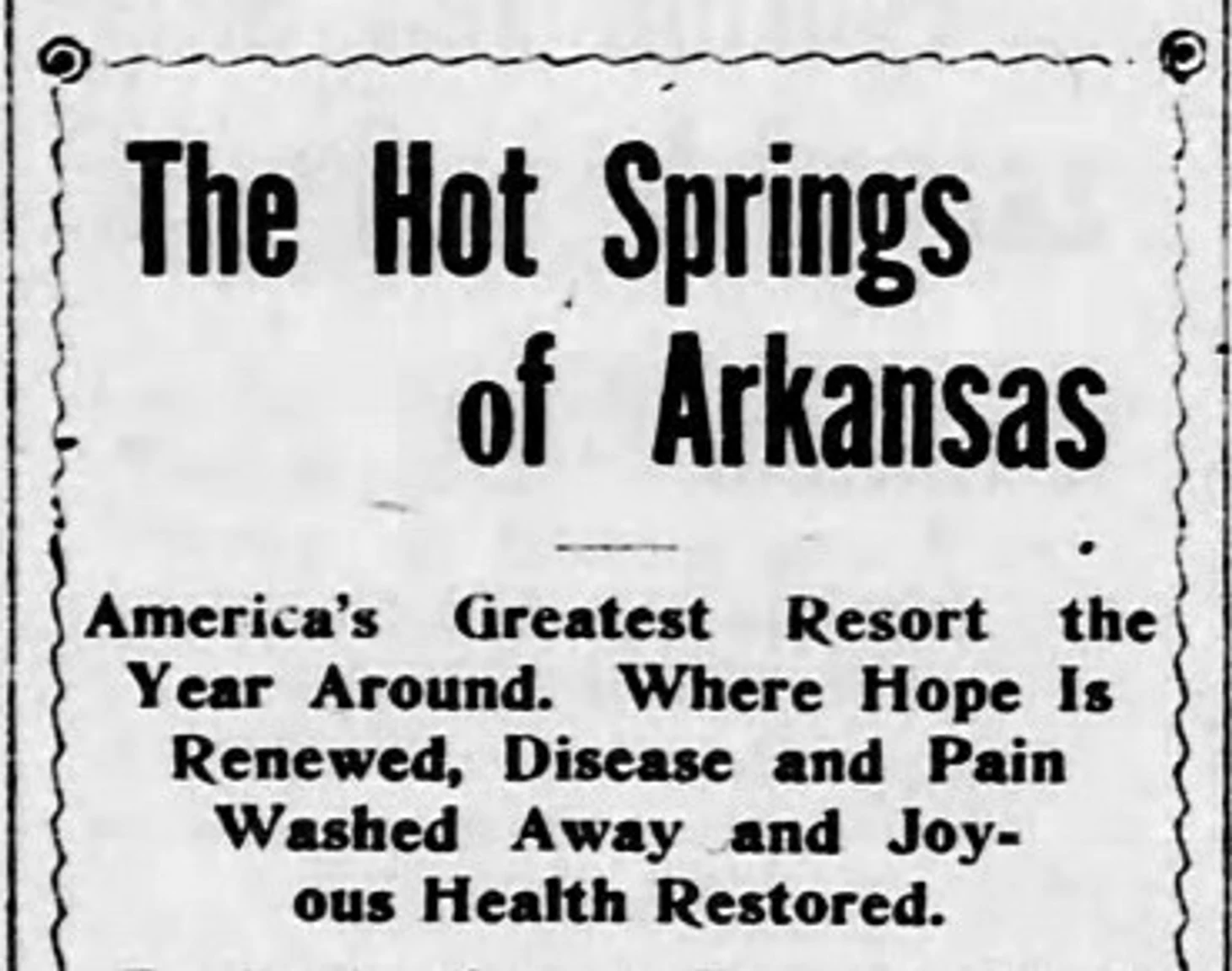 К концу 19 века Хот-Спрингс стал первым главным курортом США. Тут открылся госпиталь армии и флота, работали многочисленные гостиницы, бани, салуны, бордели, бары и точки с азартными играми всех видов. Приезжали не только обычные туристы, но и знаменитости, шулеры и гангстеры, включая Аль Капоне, певички и прочие дамы разной степени доступности. Spa City предлагал все в стиле Лас-Вегаса еще до того, как появился Лас-Вегас. Вплоть до 1960-х годов правительство называло городок местом крупнейшей нелегальной игорной деятельности в США. Спасли жесткие федеральные меры. Постепенно и индустрия купания пришла в упадок.