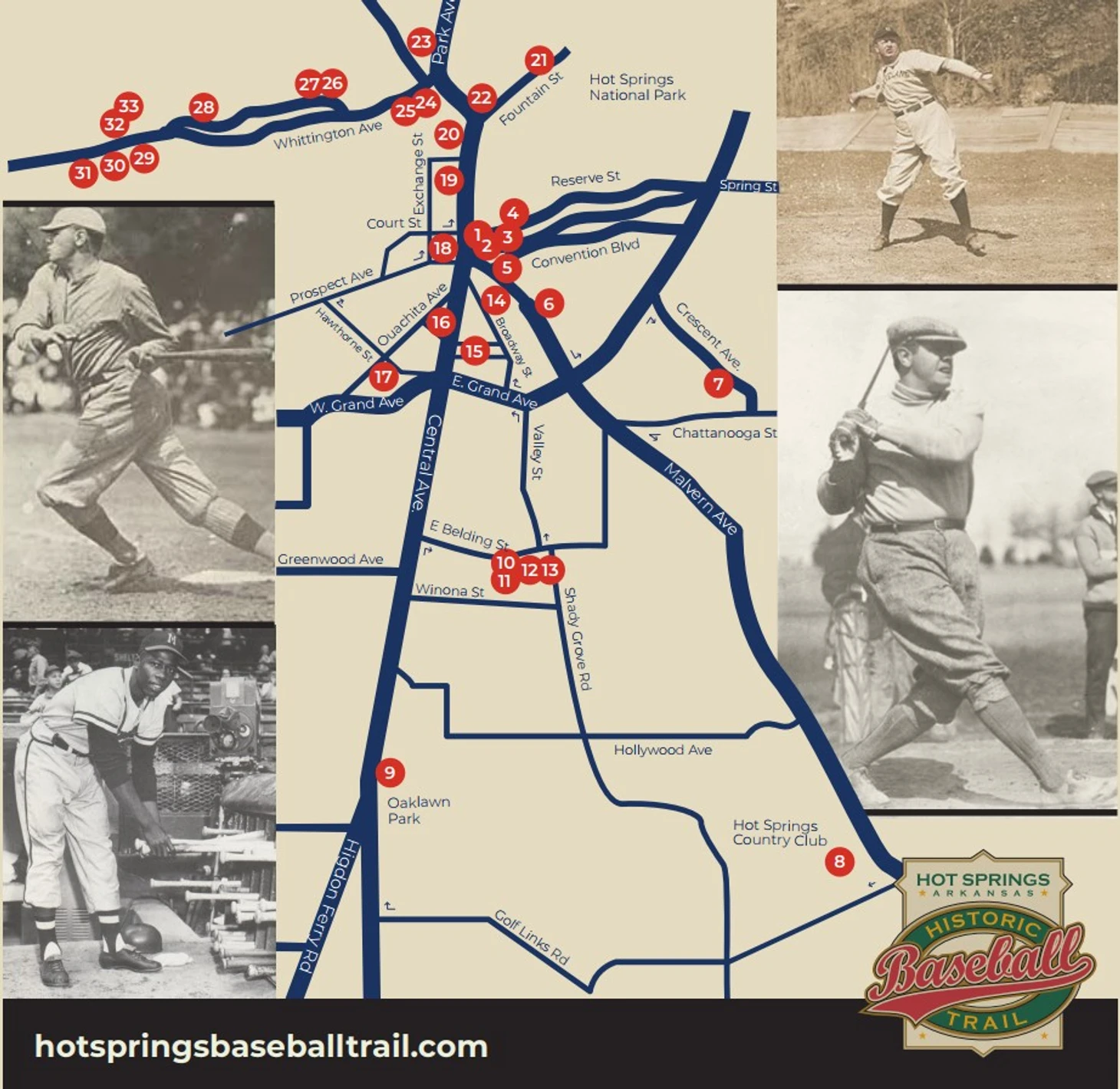 Называется маршрут Hot Springs Baseball Trail, появился в 2011 году и увековечил знаковые исторические события, связанные с Весенними тренировками в городе и отдыхом звезд. На данный момент точек 33. Есть сайт и приложение в App Store и Google Play, плюс PDF-файл с картой. Можно прогуляться по местам, где бывали легендарные Бейб Рут и Сай Янг, Хонус Вагнер и Хэнк Аарон, Джеки Робинсон и Стэн Мьюзиел. Через истории, фотографии, видео- и аудиозаписи легко узнать о роли Арканзаса в становлении бейсбола.