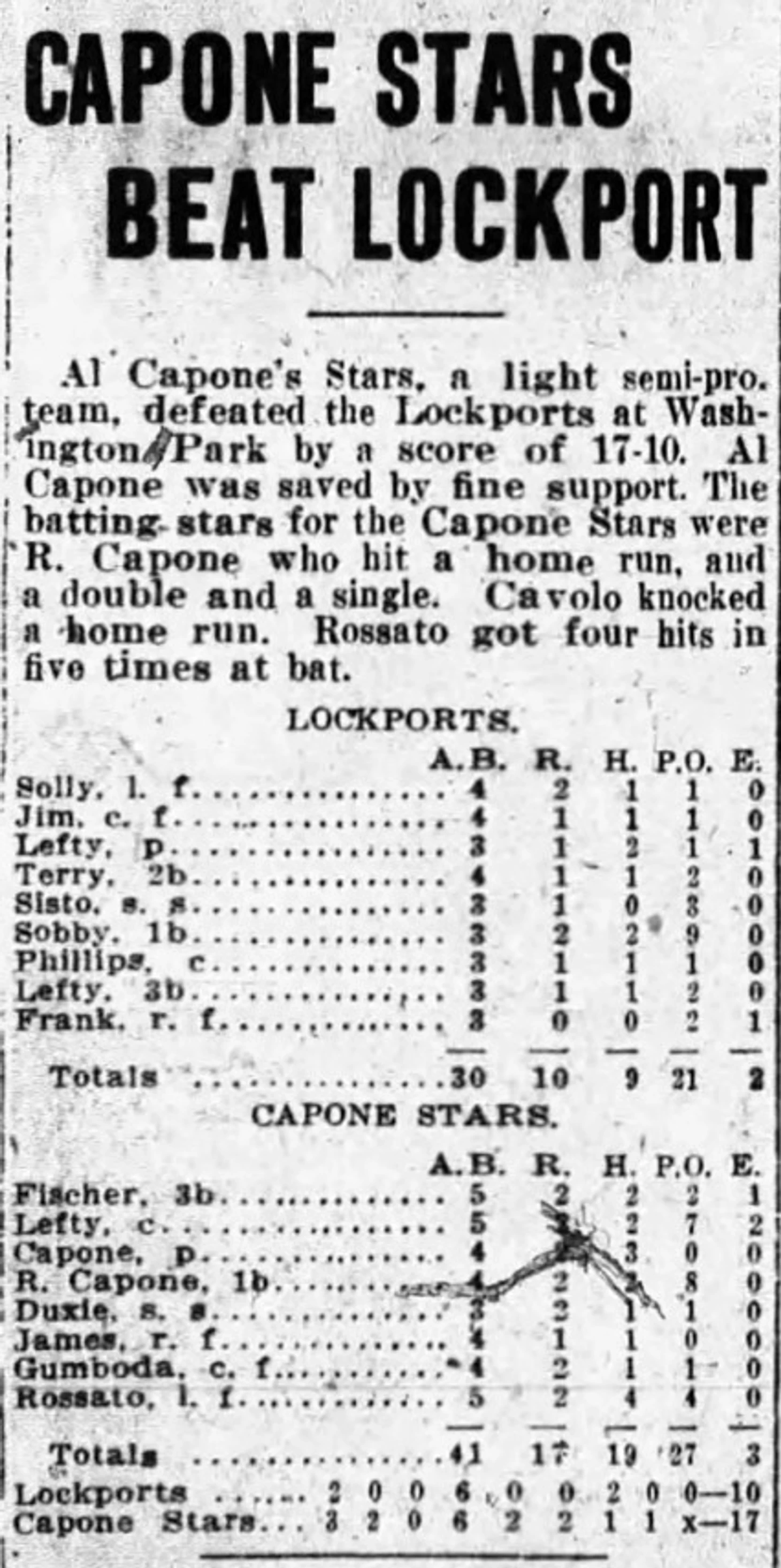 Альфонсе Габриэль Капоне родился в Бруклине в 1899 году в семье эмигрантов с юга Италии. Изучая старые газетные вырезки о Католическом клубе молодежи, что находился рядом с церковью Святого Михаила, исследователи обнаружили занятные факты о гангстере и его старшем брате Ральфе. Оказалось, последний начал играть в бейсбол в 1912 году в возрасте 18 лет в команде под названием Algerians. Эл, который был на пять лет моложе, ходил за братом по пятам, в том числе и на местные импровизированные бейсбольные площадки. Оба были заявлены за команду St. Michael’s в 1916 году. Будущий бандит, бутлегер и сутенер — первым бейсменом, его родственник — питчером. Затем братья основали Al Capone Stars и поменялись позициями. В издании Brooklyn Citizen откопали информацию о встречах с командами Dundees и Lockport A.C. Журналисты хвалили Эла на горке.