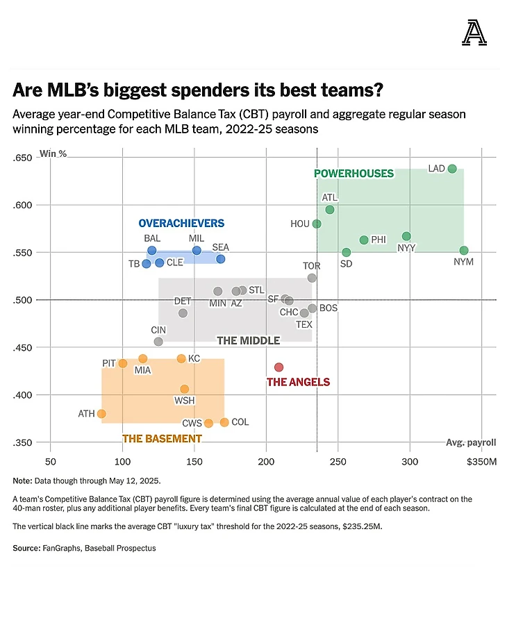 С учетом возможной остановки чемпионата мы решили изобразить этот принцип наглядно – по крайней мере, в рамках текущего коллективного договора, действующего с 2022 года. По оси X мы отложили процент побед в регулярных сезонах с этого периода. По оси Y – налогооблагаемую платежную ведомость (CBT), согласно данным Baseball Prospectus. Получившаяся диаграмма показала четыре четкие группы, одну явную аномалию – и общее понимание нынешней конкурентной среды в лиге.