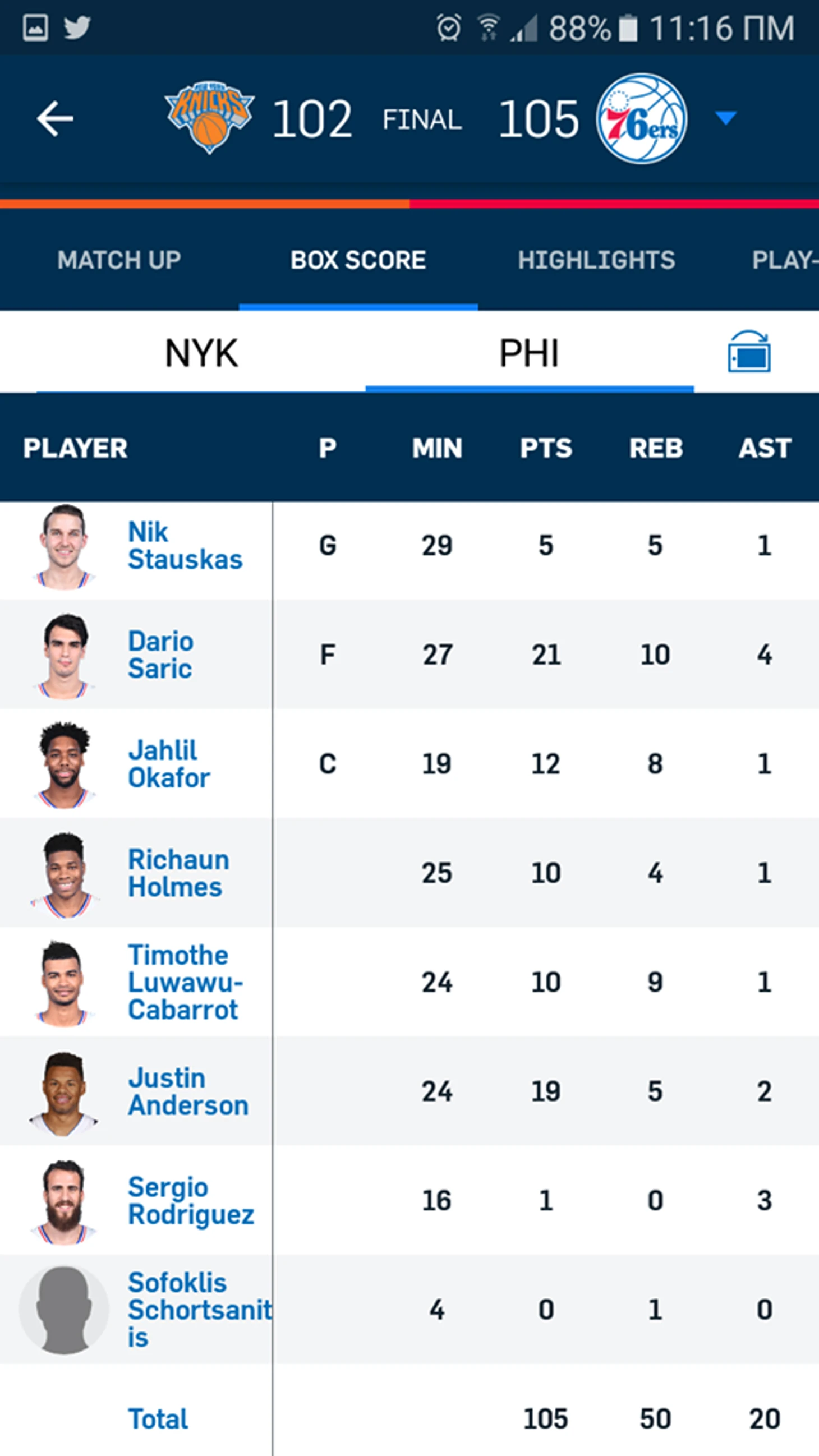 Согласно протоколу ESPN.com на пятничный матч «Сиксерс» – «Никс», греческий центровой Софоклис Схорцианитис отыграл 4 минуты за команду из Филадельфии и записал на свой счет 1 подбор.