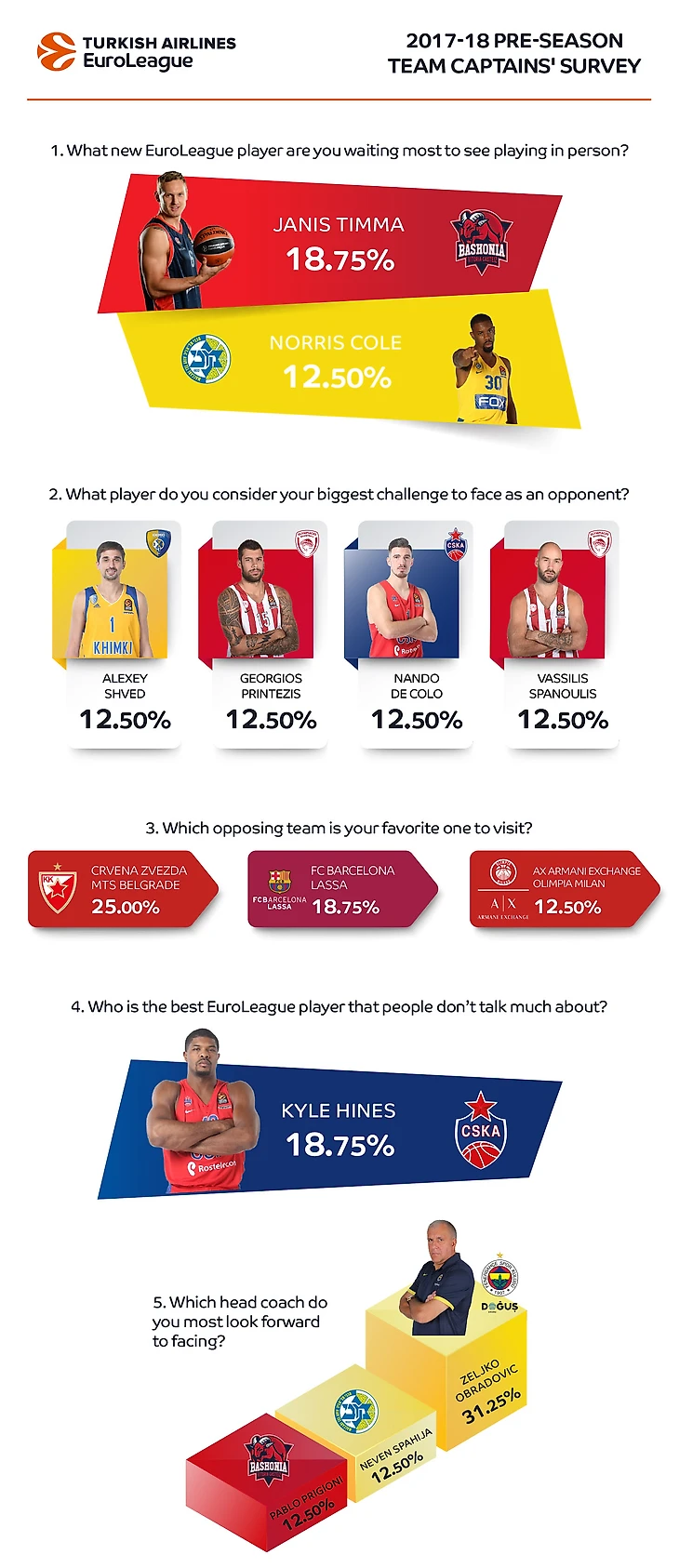 Официальный сайт Евролиги провел опрос среди капитанов всех команд, участвующих в сезоне-2017/18, задав вопросы об их любимых городах, самых сложных соперниках, а также об игроках и тренерах, встречи с которыми они особенно ждут.