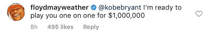 Флойд Мэйвезер вызвал бывшую звезду «Лейкерс» Кобе Брайанта на дуэль. Завершивший карьеру известный боксер написал в Instagram, что готов сыграть с Брайантом «1 на 1» на 1 миллион долларов.