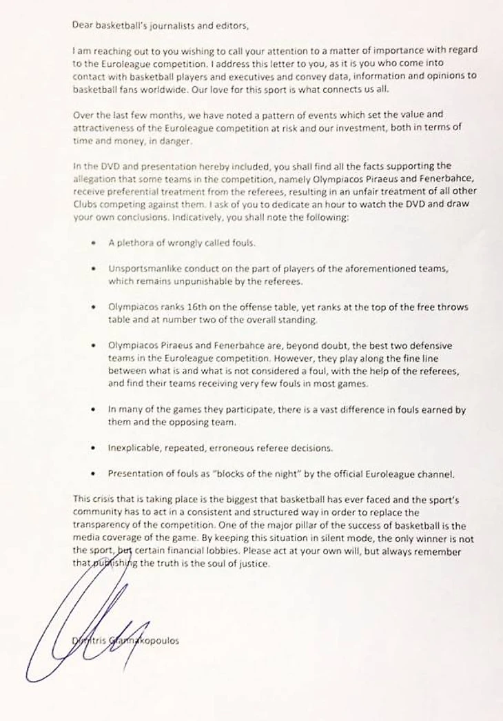 Это самый крупный кризис в истории баскетбола, и спортивное сообщество должно планомерно и организованно изменить прозрачность турнира. Одним из основополагающих элементов успеха баскетбола является освещение в СМИ. От того, что проблема замалчивается, выигрывает не спорт, а определенные финансовые лобби», – передает текст письма Яннакопулоса Eurohoops.