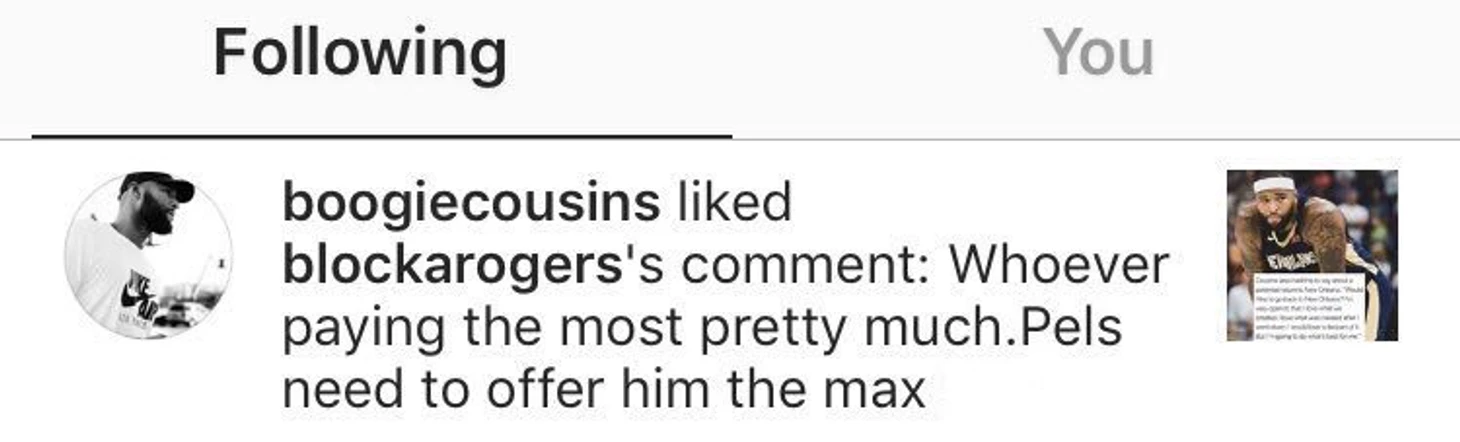 Центровой «Нового Орлеана» Демаркус Казинс лайкнул сообщение в Instagram о том, что он подпишет контракт с командой, которая предложит ему максимальную сумму.