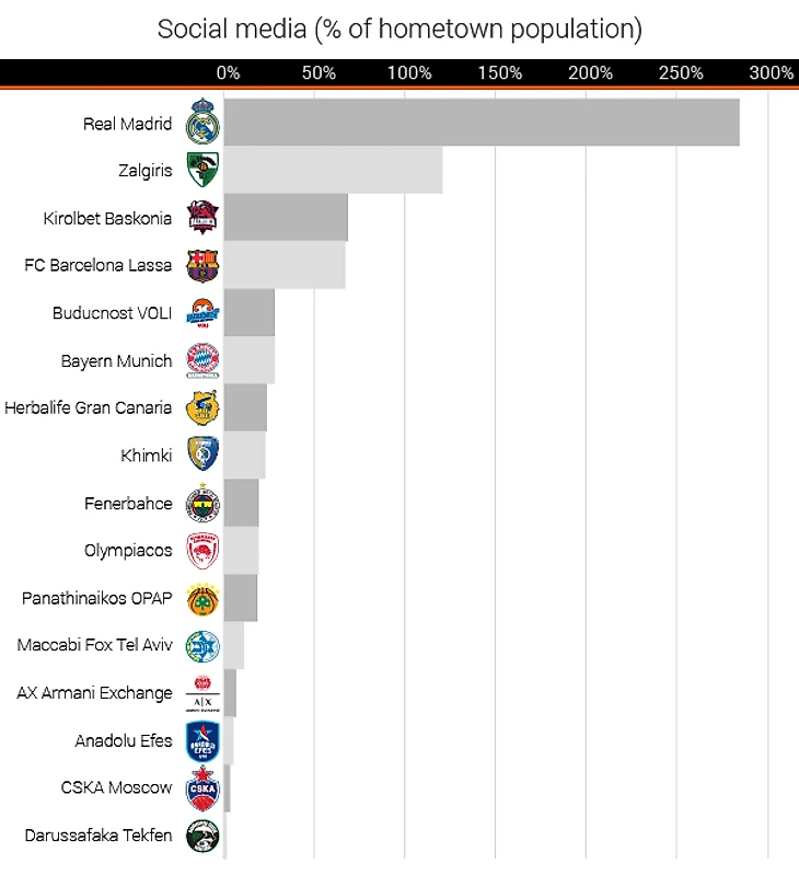 Издание также исследовало популярность различных клубов в социальных сетях. Здесь у «Реала» нет конкурентов – количество подписчиков клуба в социальных сетях составляет 287 процентов от населения Мадрида.