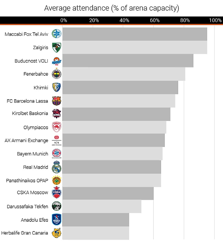 RunRepeat проанализировал посещаемость матчей Евролиги в прошедшем регулярном чемпионате. Согласно результатам исследования, средняя заполняемость арен всех команд Евролиги составляет 68 процентов. При этом, только болельщики «Жальгириса» и «Маккаби FOX» заполняют свои арены больше, чем на 90 процентов (95).