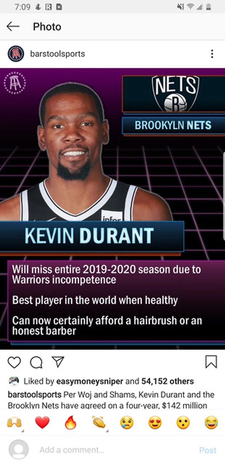 Дюрэнт поставил лайк посту, в котором говорится о его переходе в «Бруклин» и, в частности, отмечается, что звездный форвард пропустит предстоящий сезон из-за некомпетентности «Голден Стэйт».