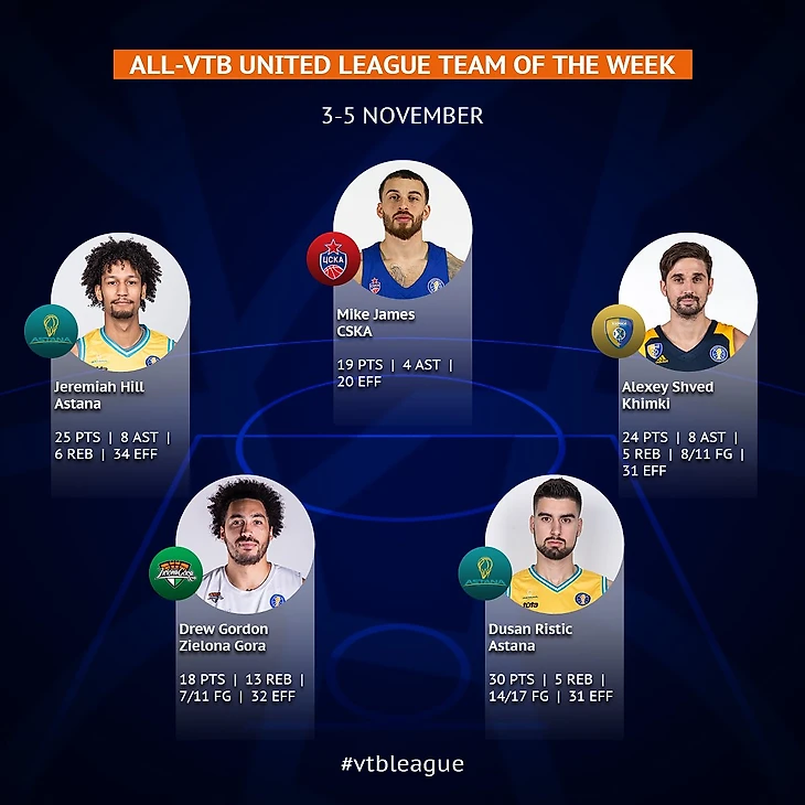 В пятерку лучших игроков недели вошли Алексей Швед («Химки»), Майк Джеймс (ЦСКА), Джеремайя Хилл («Астана»), Дрю Гордон («Зелена-Гура») и Душан Ристич («Астана»).