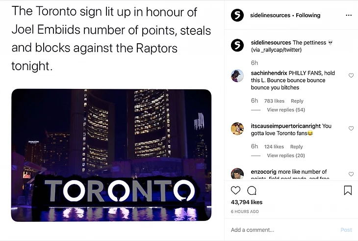 «Символ Торонто демонстрирует количество очков, перехватов и блок-шотов, которые Джоэл Эмбиид набрал сегодня против «Рэпторс», – говорится в инстаграме города.