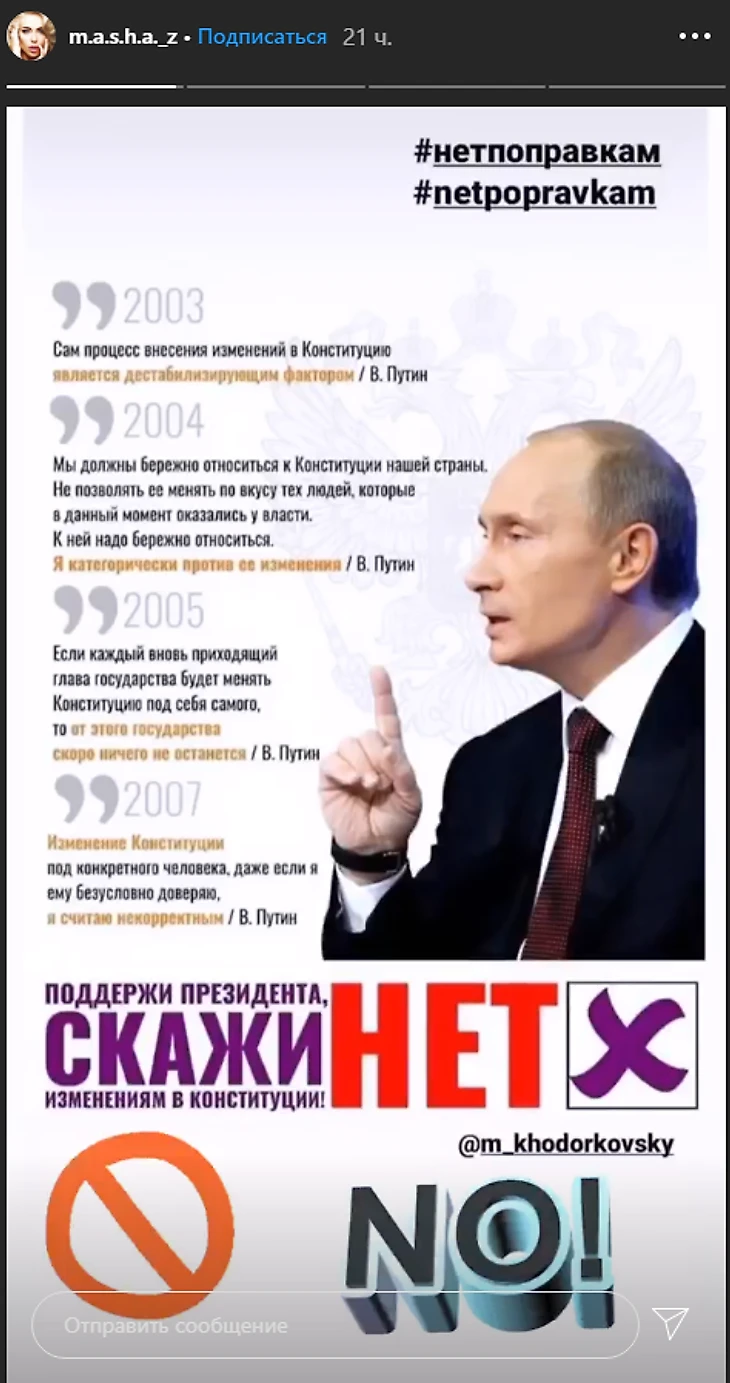 Супруга форварда «Зенита» и сборной России Андрея Зубкова Мария выступила против поправок в Конституцию.