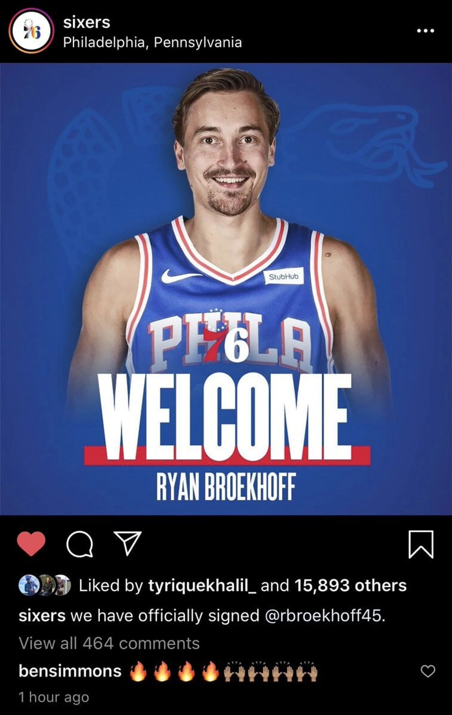 Разыгрывающий «Филадельфии» Бен Симмонс отреагировал на подписание своим клубом контракта с форвардом Райаном Брокхоффом.