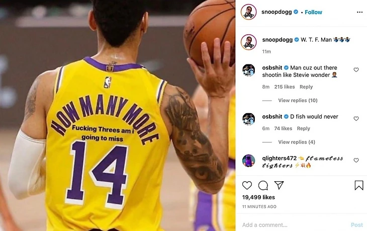 Рэпер Снуп Догг, который является известным болельщиков команды из Лос-Анджелеса, опубликовал на своей странице в инстаграме мем с игроком, где говорится: «Сколько еще трехочковых я собираюсь промазать?».