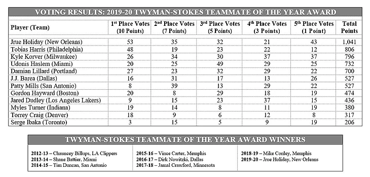 Защитник «Нового Орлеана» Дрю Холидэй получил награду имени Тваймена-Стоукса, которая вручается лучшему партнеру по команде в прошедшем сезоне.