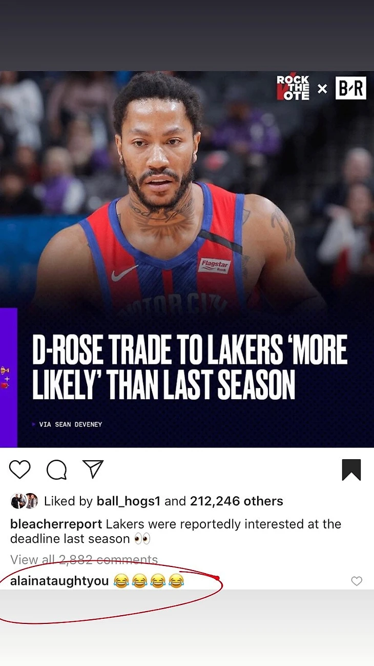 Жена разыгрывающего «Детройта» Деррика Роуза, Алиана Андерсон, публично посмеялась над сообщением о возможном переходе мужа в «Лейкерс».