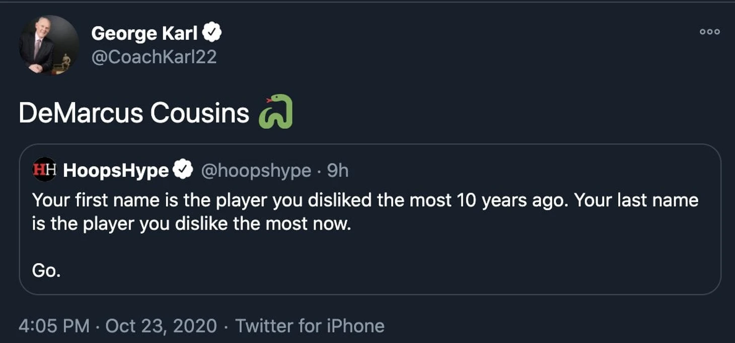 Бывший главный тренер «Сакраменто» Джордж Карл отреагировал на предложение твиттер-аккаунта Hoops Hype назвать своего самого нелюбимого игрока 10 лет назад и сейчас.