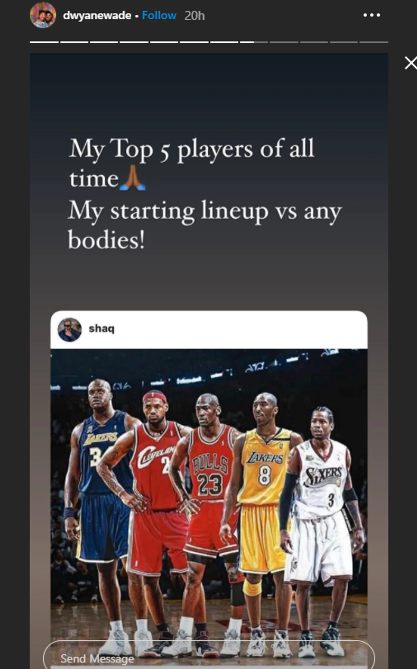 «Моя пятерка лучших игроков всех времен. Мой стартовый состав против кого угодно», – написал Уэйд в сторис.