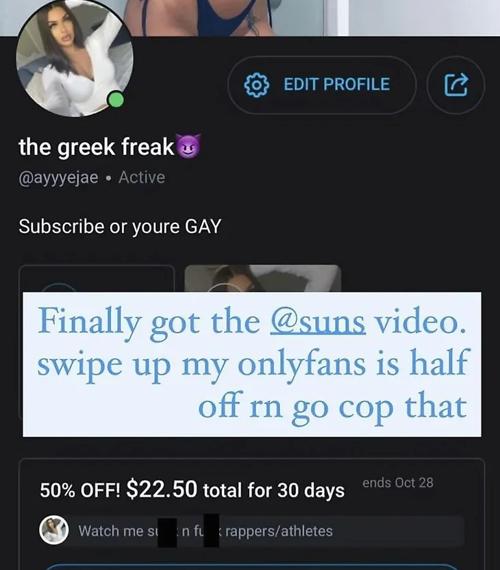 Ализа недавно написала в социальных сетях, что у нее «наконец-то появилось видео с игроками «Санз». Она предлагает посмотреть его на OnlyFans.
