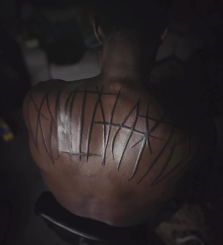 На спину 1-го номера драфта-2018 нанесено выполненное сочетанием шрамирования с татуировкой прозвище баскетболиста DOMINAYTON.