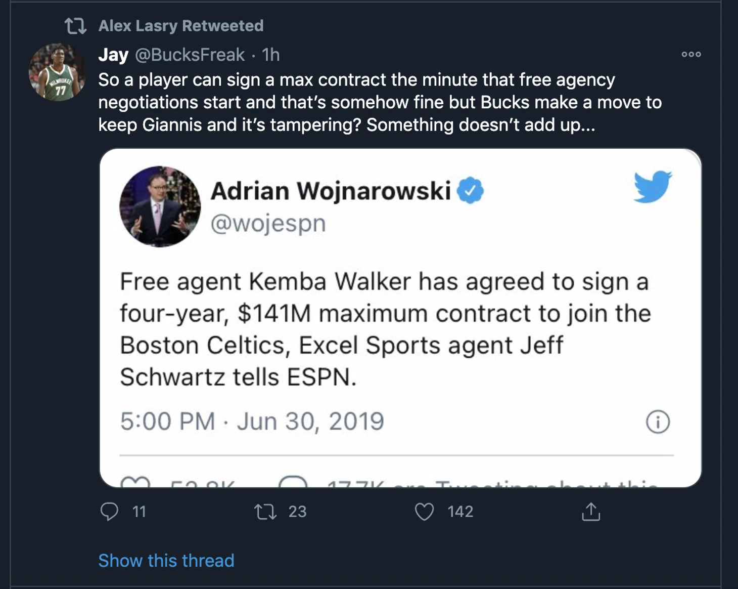 После того, как лига начала расследование против «Бакс» из-за возможного нарушения правила тамперинга при попытке договориться о сделке «сайн-н-трейд» с участием защитника «Сакраменто» Богдана Богдановича, Ласри ретвитнул несколько сообщений о том, как другие команды совершали то же самое в предыдущие годы и оставались безнаказанными.