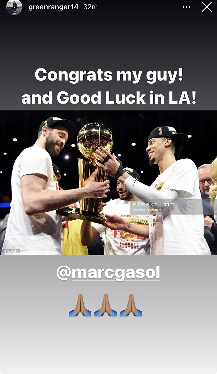Грин и Газоль вместе выступали за «Торонто» в сезоне-2018/19 и помогли команде завоевать титул чемпиона НБА.