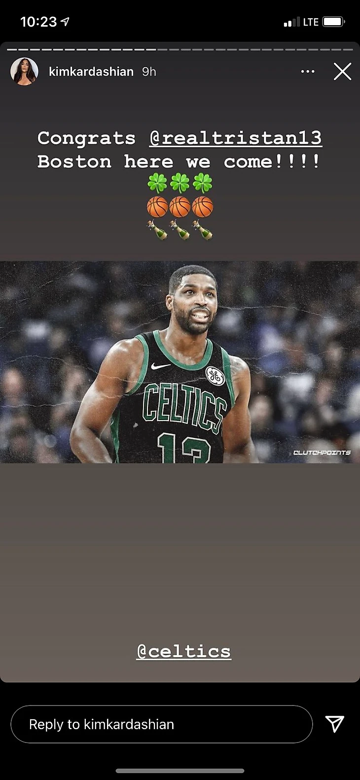 Ким Кардашьян – о переходе Тристана Томпсона в «Селтикс»: «Бостон», вот и мы!»