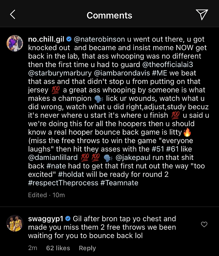 «Гил, с тех пор, как Леброн коснулся твоей груди и сделал так, что ты смазал те два броска с линии, мы так и ждем, когда ты вернешься», – написал Янг в комментариях.