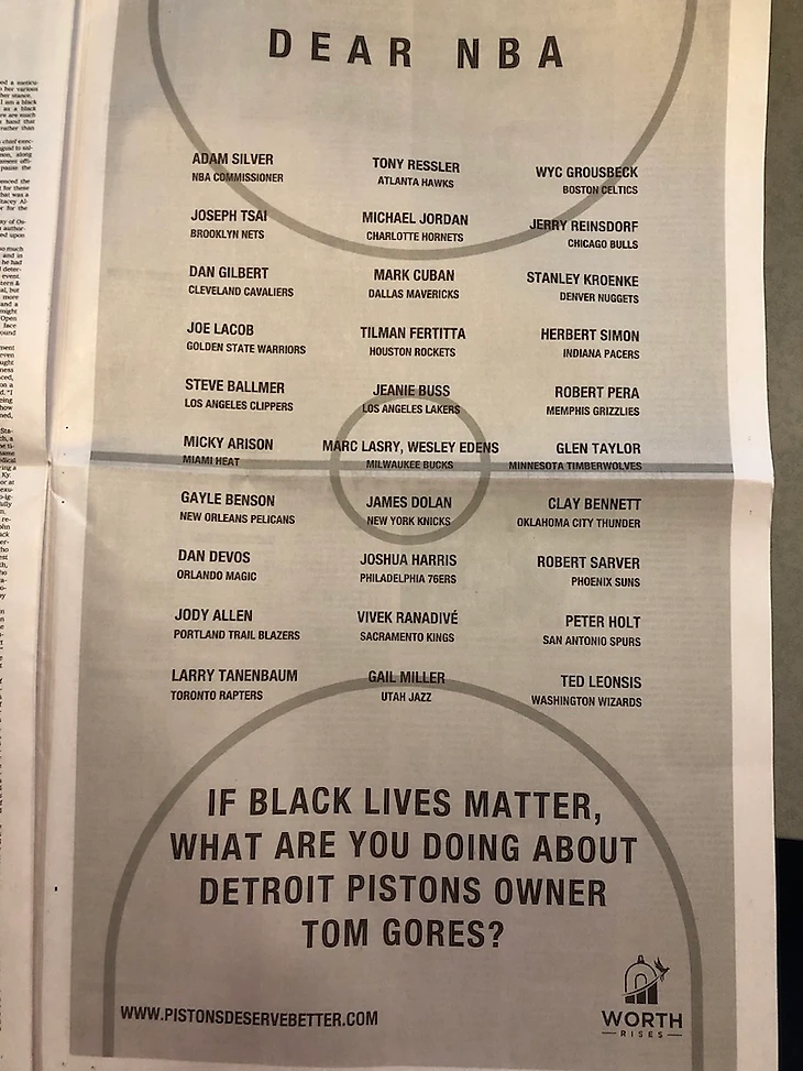 Worth Rises выкупила рекламную полосу в The New York Times, где обратились к комиссионеру Адаму Сильверу и владельцам 29 клубов: «Если жизни чернокожих важны, то что вы скажете по поводу владельца «Пистонс» Тома Горса?»