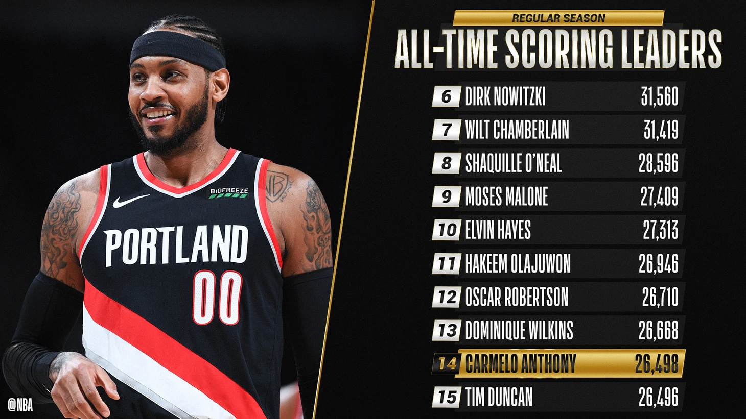 Форвард «Портленда» Кармело Энтони вошел в число лучших 14 игроков в истории НБА по набранным очкам.