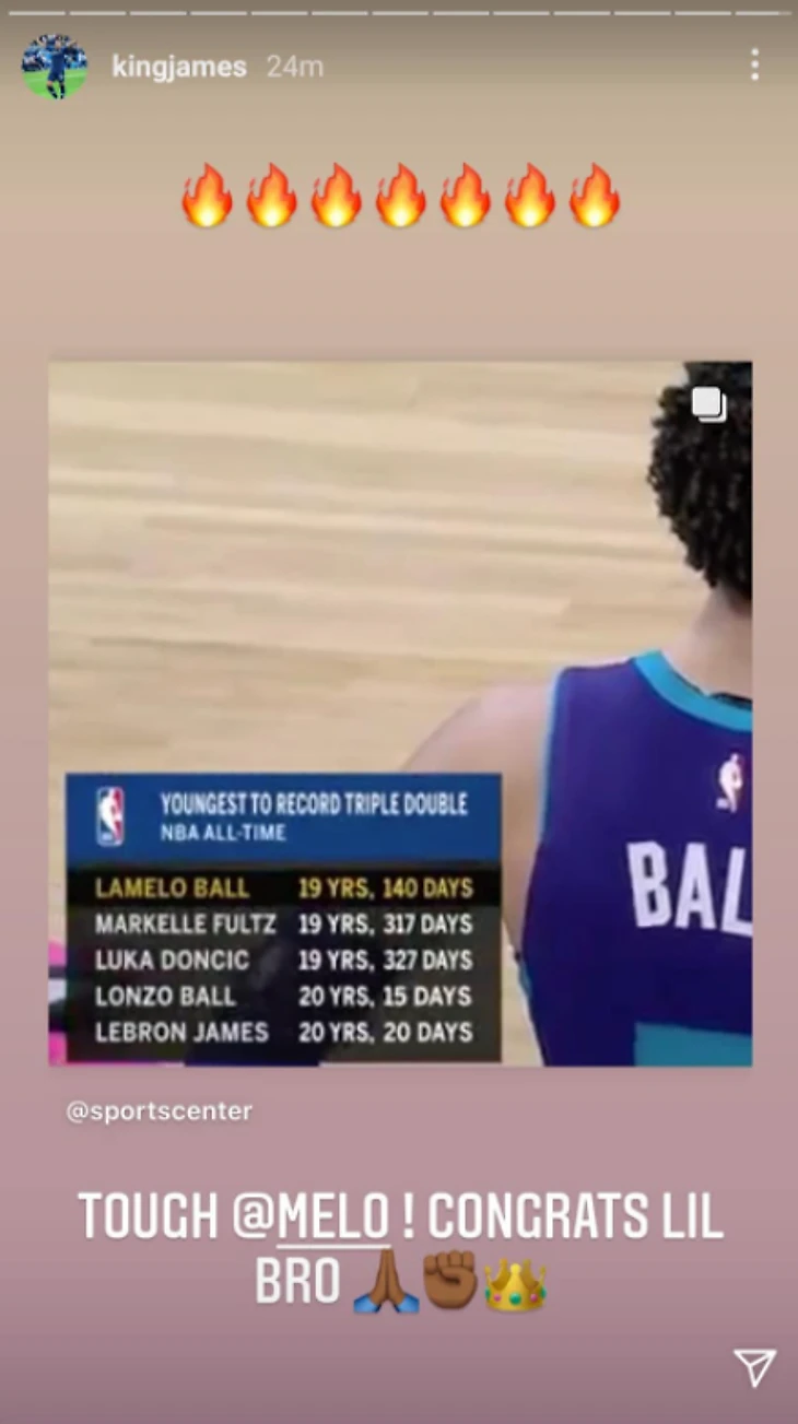 Звездный форвард «Лейкерс» Леброн Джеймс в сторис инстаграма поздравил новичка «Шарлотт» Ламело Болла с рекордом.