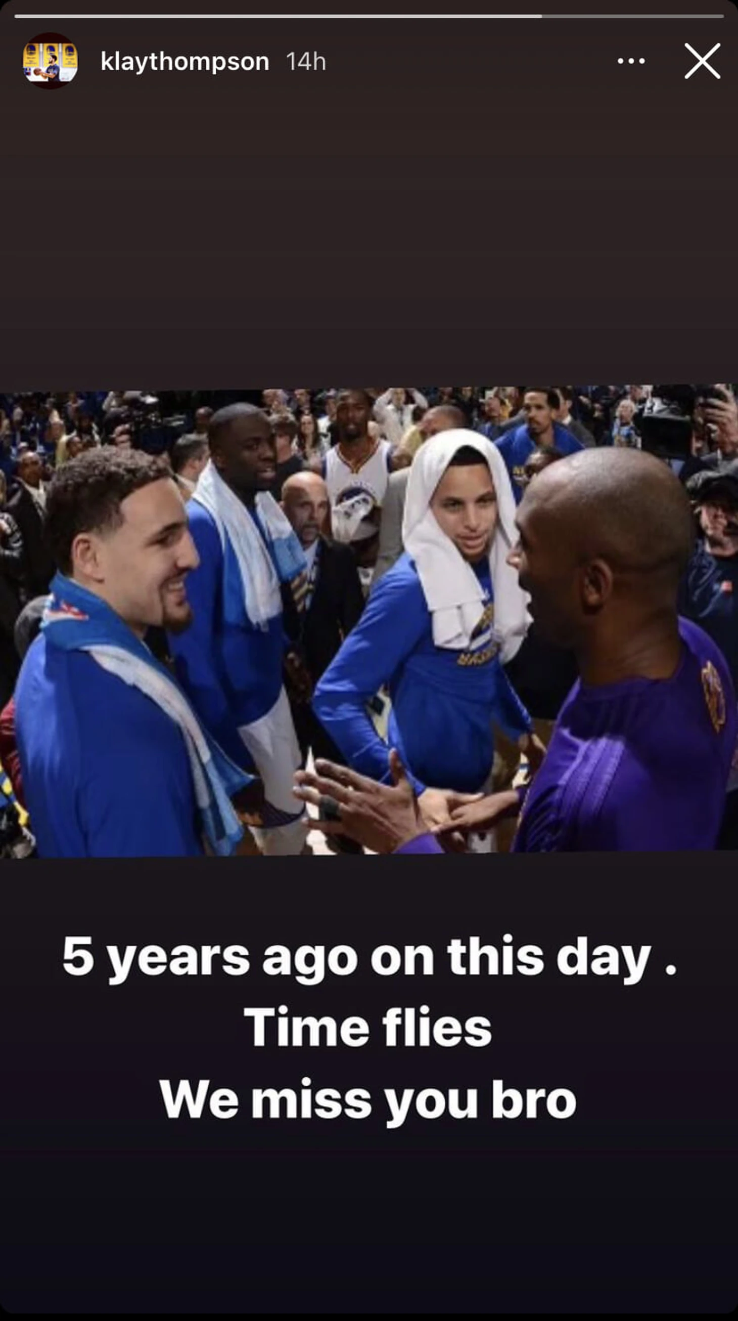 Томпсон опубликовал фотографию, где он и разыгрывающий «Уорриорз» Стефен Карри общаются с Кобе после матча. Брайант погиб в январе прошлого года в результате крушения вертолета.