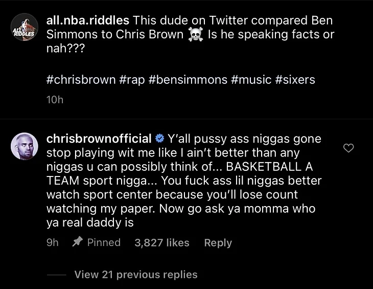 Американский певец и актер Крис Браун злобно отреагировал на пост в твиттере, в котором его сравнили с игроком «Филадельфии» Беном Симмонсом.